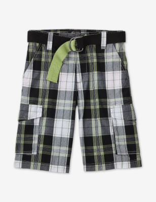 Zip fly with button closure Front and back pockets Side flap cargo pockets Plaid pattern Includes solid woven belt 60% cotton / 40% polyester Machine washable Imported