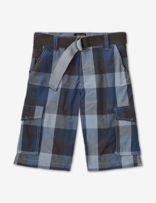 Zip fly with button closure Front and back pockets Side flap cargo pockets Plaid pattern Includes solid woven belt 60% cotton / 40% polyester Machine washable Imported